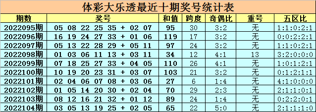上期开奖:大乐透第2022104期奖号为:03 05 13 19 25 + 02 05,前区号码和值为65,跨度为22,奇偶比为5:0,无重号,五区比为2:1:1:1:0。