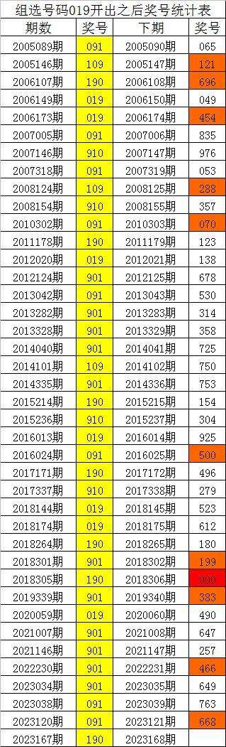 体彩排列三组选号码019历史上出现了40次,其下期奖号分别为:065、121、696、049、454、835、976、053、288、357、070、123、138、678、530、314、358、725、750、753、154、304、925、500、496、279、523、612、180、199、000、383、490、647、257、466、649、763、668,详细统计见下表: