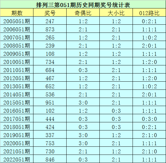排列三第2023051期开奖日期:2023年3月2日,历史上第051期已开出了18次奖号,历年同期号码分别为:247、873、265、239、108、734、684、467、652、536、951、102、444、424、337、753、730、846。