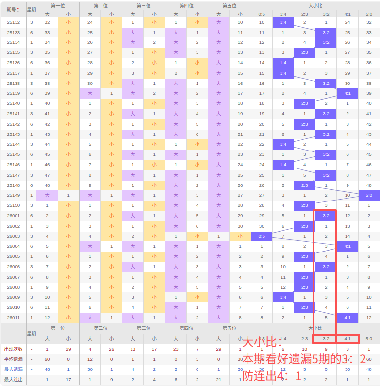 上期大小比:4:1,近10期大小比出现情况:2:3、0:5、4:1、2:3、3:2、2:3、2:3、1:4、2:3、4:1,最近10期出现1期3:2,出现5期2:3,出现2期4:1,出现1期1:4,出现0期5:0,出现1期0:5,根据近10期规律本期看好遗漏5期的3:2,防连出4:1,综上所述推荐大小比推荐:4:1,重点关注:3:2。