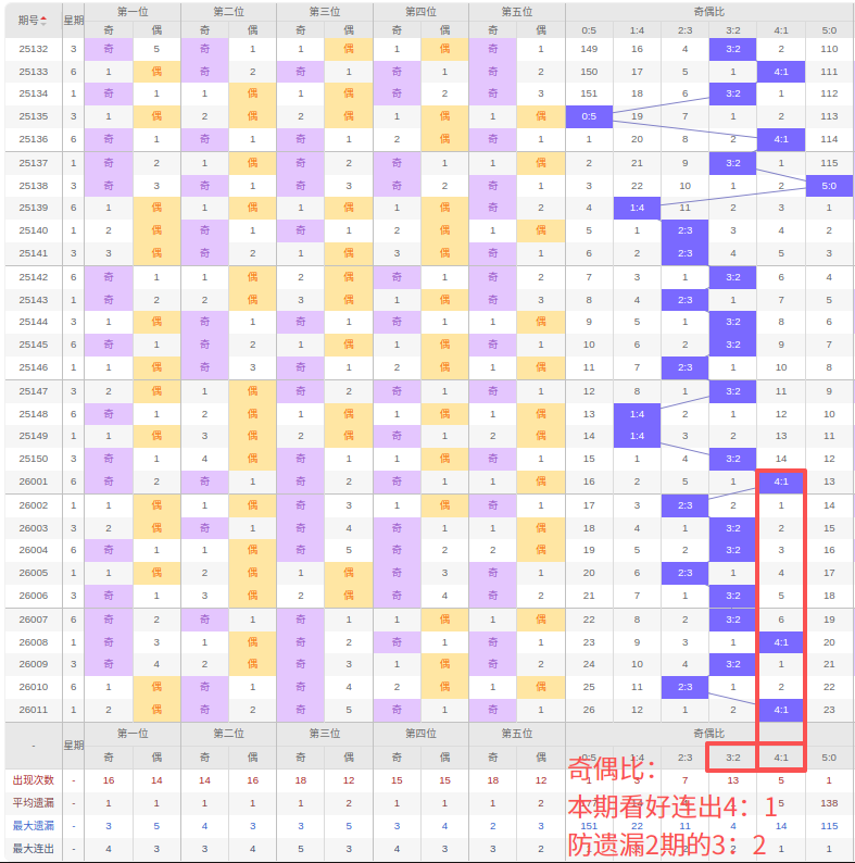 上期奇偶比:4:1,近10期奇偶比出现情况:2:3、3:2、3:2、2:3、3:2、3:2、4:1、3:2、2:3、4:1,最近10期出现5期3:2,出现3期2:3,出现2期4:1,出现0期1:4,出现0期5:0,出现0期0:5,根据近10期规律本期看好连出4:1,防遗漏2期的3:2,综上所述推荐奇偶比推荐:3:2,重点关注:4:1。