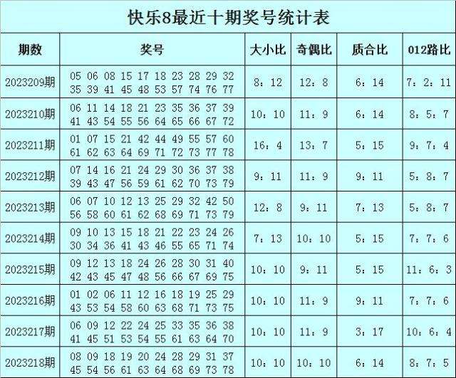 福彩快乐8第2023218期开奖回顾:08 09 18 19 20 24 28 29 31 37 45 54 56 61 63 64 68 69 73 78,其中奖号大小比开出10:10,奇偶比开出10:10,质合比开出6:14,012路比开出8:7:5。