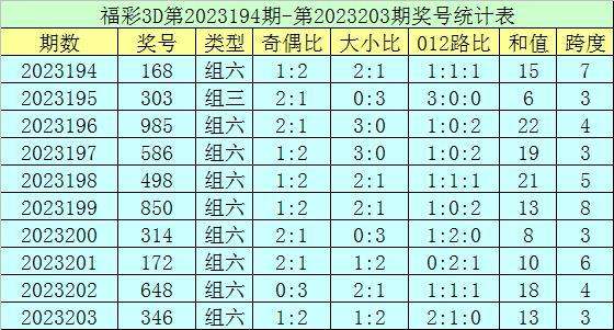 上期回顾:福彩3D第2023203期开奖号码为346,组选类型为组六,奇偶比为1:2,大小比为1:2。