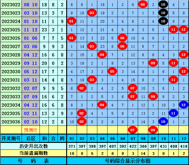 后区分析(定义:01-04为一区,05-08为二区,09-12为三区):上期后区开出奖号02和10,分别出现在第一区和第三区和区,最近10期后区三个区间落号个数比为7:4:9,本期后区注意第二区和第三区号码出现,关注两码07、09。