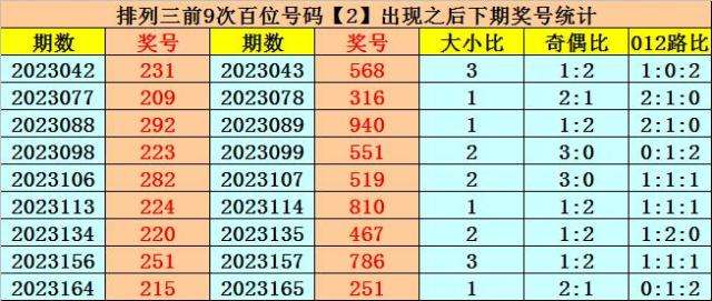 百位号码:百位上期奖号为2路、奇数、小号:2,历史上百位号码2共开出649期,前一次开出期数在第2023164期,上期开出重复号码。