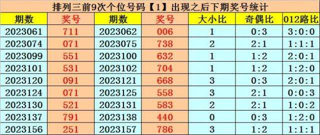 个位前9次开出号码1时,该位下期奖号分别为:6-8-2-4-8-8-3-0-6,其中号码个数012路比是4:1:4,奇偶比是1:8,大小比是5:4。