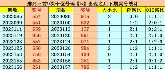 十位号码:十位上期开出奇数、小号、2路号码:5,历史上十位号码5共开出648期,上一次出现在第2023156期,上期奖号遗漏值为8期。