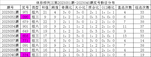 开奖公告:体彩排列三第2023040期开出奖号:334。组三,有重号:3,奇偶比2:1,大小比0:3,012比2:1:0,和值10,跨度1。