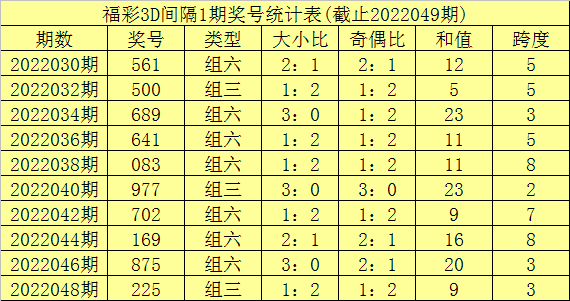 跨度:前5期跨度在3-6之间波动,振幅为4点,走势比较集中,上期开出跨度6,走高3点,本期注意跨度走低,参考跨度4。