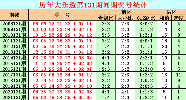 在历史同期开奖中,后区号码和值奇偶为6:8,其中奇号和值出现相对较少,本期适当关注奇号和值回补,参考和值17。