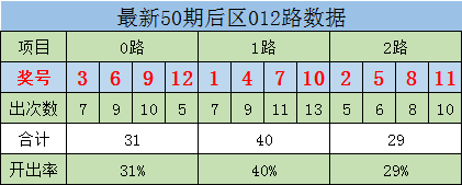 通过后区数据分析1路奖号开出率略高,0路,2路奖号开出率略低,其中奖号01、05、06,出现次数较少,出现次数7+的奖号02、03、04、07、08、09、10、11、12作为重点关注。本期后区奖号参考:04、11