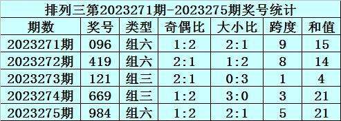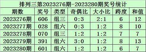 上期回顾:排列三第2023280期开奖号码为601。奖号类型为组六,奇偶比为1:2,大小比为1:2,跨度为6,和值为7。