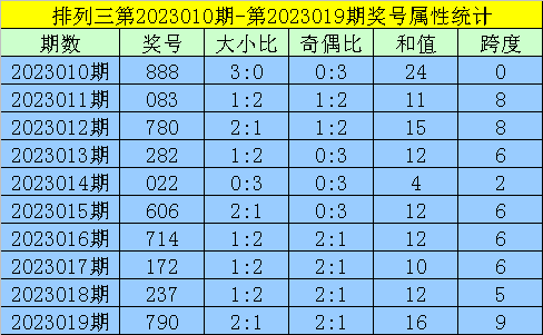上期回顾:排列三第2023019期出现奖号790。开出组六,奇偶比2:1,012路比2:1:0,大小比2:1,和值16,跨度9。