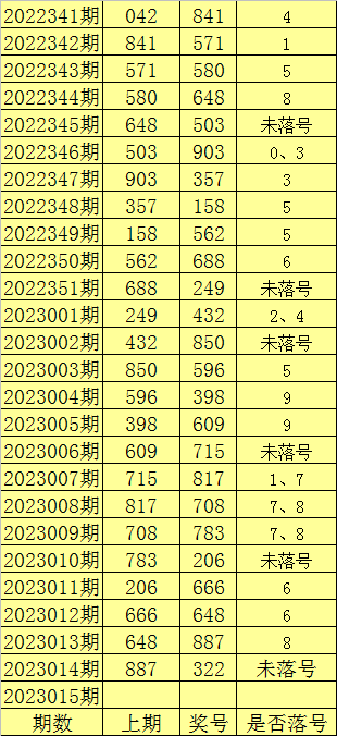 结合其它参数来看,福彩3D第2023015两码关注01、12重点关注01,独胆看好1。