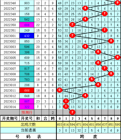 福彩3D第2023014期最大跨度开出1,近期最大跨度波动较大,本期预计最大跨度在1-5区段出现,最大跨度关注12345,重点关注跨度2。