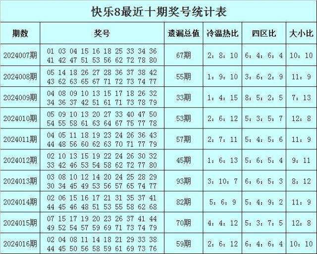 福彩快乐8第2024016期开奖回顾:02 04 08 11 14 18 21 29 33 38 44 45 50 56 58 59 61 69 73 76,其中奖号遗漏总值为59,冷温热码比为2:6:12,四区比为6:4:6:4。