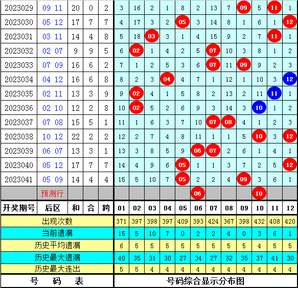 前区第一位:上期奖号为05,开出2路号码,最近10期2路号码出现3次,出现次数与理论相当,本期可以排除,目前1路号码轮空1期,本期防止再出,关注号码01。