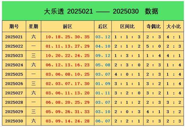 上期回顾:大乐透第2025030期奖号为:前区03、09、14、24、28,后区06、07,前区奖号三区比为2:2:1,奇偶比为2:3,大小比为2:3,后区开出小大组合06、07