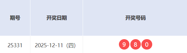 排列三第25331期的开奖号码为 9 8 0。