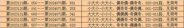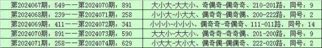 所以,排列三第2023124期奖号:071,与排列三第2024075期奖号可能没有同号。且排列三第2024075期奖号大小比、奇偶比和012路比不会与第2023124期奖号直选形态:小大小、偶奇奇和011路全部相同。
