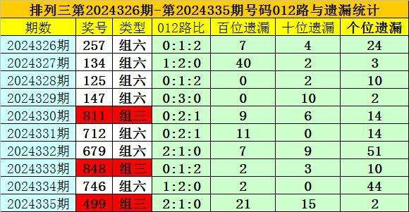 开奖回顾:排列三第2024335期奖号为:499,类型为组三,号码012路比为2:1:0,百十个位号码直选分别遗漏21期、15期和2期。