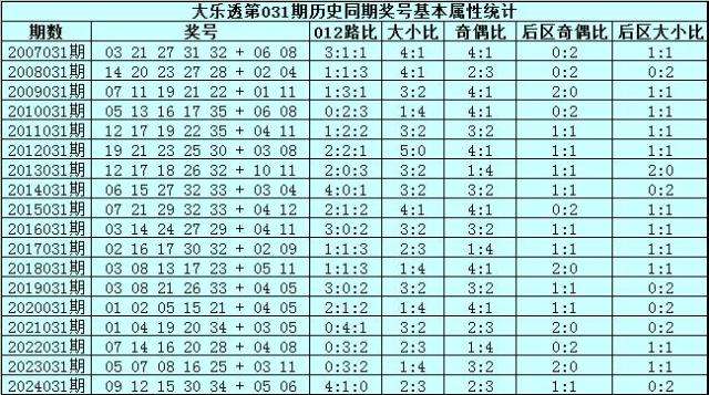 前区大小比推荐:第031期历史同期奖号中,号码大小比总比例为48:42,其中大小比0:5→0次、1:4→4次、2:3→3次、3:2→7次、4:1→3次、5:0→1次,开出比例较高,本期注意大号再次热出,关注大小比4:1。