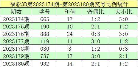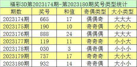 福彩3D第2023180期回顾:奖号为932,奖号奇偶比为2:1,大小比为1:2,和值为14,类型为组六。