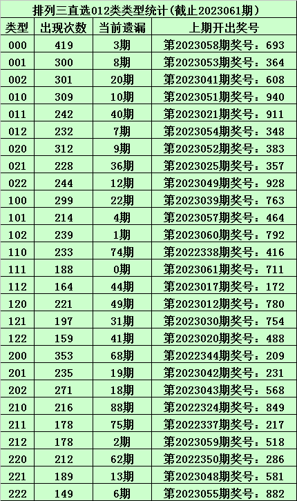 上期回顾:体彩排列三第2023061期开出奖号:711,其012路比为0:3:0,奖号012路类型为:111。