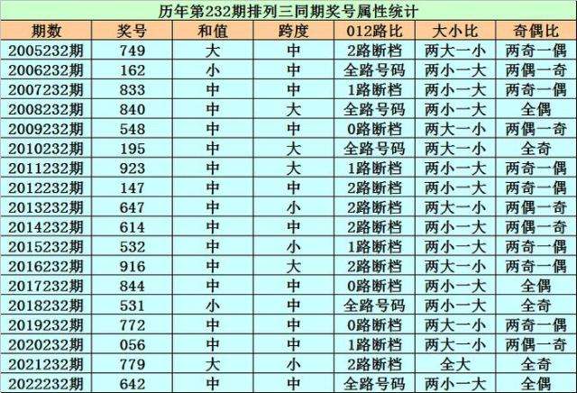 历史上第2023232期排列三已开出18期奖号了,历年同期奖号分别为:749、162、833、840、548、195、923、147、647、614、532、916、844、531、772、056、779、642,详细统计见下表: