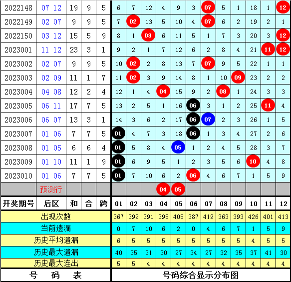上期回顾:体彩大乐透第2023010期开出奖号05 06 13 23 26 + 01 06,其中前区奖号奇偶比为3:2,三区比为2:2:1,后区奖号奇偶比为1:1,大小比为0:2。