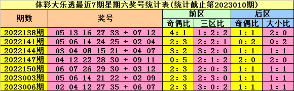 体彩大乐透上周星期六(第2023006期)奖号为02 04 12 27 35 + 06 07,其中前区奖号奇偶比为2:3,三区比为3:0:2,后区奖号奇偶比为1:1,大小比为1:1。
