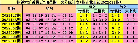上期回顾:体彩大乐透第2022014期开出奖号01 04 10 18 32 + 01 09,其中前区奖号奇偶比为1:4,三区比为3:1:1,后区奖号奇偶比为2:0,大小比为1:1。