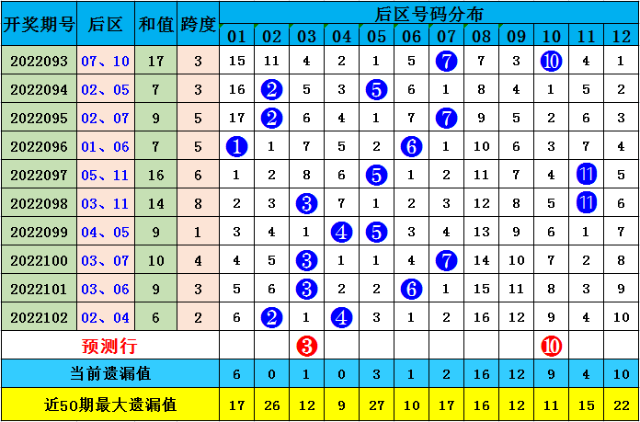 前第一区(1-12):上期该区开2个奖号01、05,近10期号码01出现2次,号码05出现3次。近10期一区号码奇偶比为13:9,012路比为5:9:8,本区号码大范围参考:02、03、05、07、08,胆码关注03。