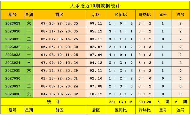 上期回顾:大乐透第2023038期奖号为:前区04、10、18、27、32,后区10、12。前区奖号三区比为2:1:2,开出0枚重号,开出0组连号。后区开出大大组合10、12