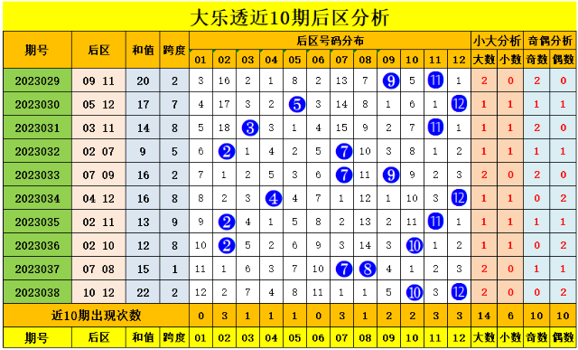 后区近10期大小比为14:6,大号码走势稍热,上期开出大大组合,本期后区推荐小大组合;