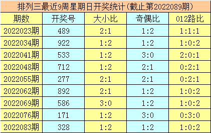 三、体彩排列三前9周星期日奖号分别开出:489-922-533-712-277-892-586-171-328,其中号码012路比为7:8:12,奇偶比为15:12,大小比为14:13;