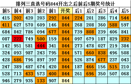 四、排列三直选号码844历史上开出10次,其前后五期奖号分别为:
