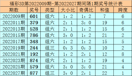 其中大小比2:1,奇偶比0:3,和值14,跨度8。