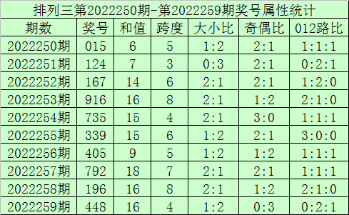 上期回顾:排列三第2022259期开奖号:448,奖号和值:16,奇偶比0:3,大小比1:2。