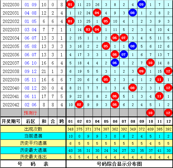 后区分析:后区上期开出号码02+06,和值为8,跨度为4。最近10区后一区(01-06)开出10个号码,断区2次,后二区(07-12)开出10个号码,断区2次,本期后一区注意号码:01、02、06;后二区注意号码:09、10、12。