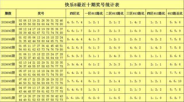 福彩快乐8第2024051期开奖回顾:07 16 26 27 29 32 35 38 42 43 44 49 51 52 53 55 57 58 72 73,其中奖号四区比为2:6:10:2,012路比为5:8:7,和值为859,跨度为66。