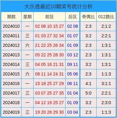 开奖回顾:第2024019期大乐透开奖号码为:19、20、26、29、30+03、04。奇偶比为2:3,012路比为1:1:3。