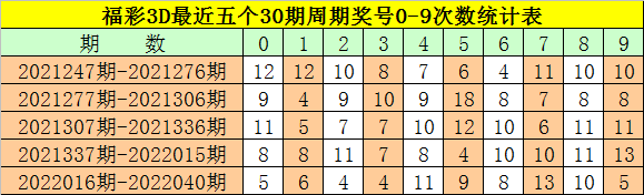 大小分析:在上一个30期周期内(第2021337期-第2022015期),奖号大小比为48:42,大号开出频次较高;在但前30期周期内(第2022016期-第2022045期),3D开奖大小比为45:45,大小号码出现比例基本持平。最近2期大号明显较热,本期不看好转冷,参考大小比2:1。