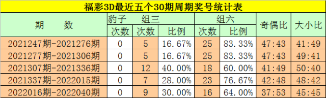 在最近一个30期周期内(第2022016期-第2022045期),豹子奖号没有出现,组三奖号开出了9次,所占比例为36%,组六奖号共出现16期,开出比例为64%,组六号码轮空2期,本期重点关注组六号码出现。