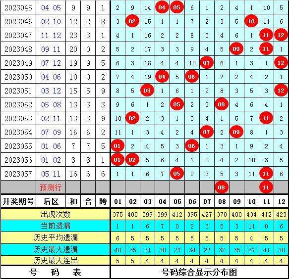 后区分析:后区上期开出奖号05、11,为全奇组合,本期后区预计开出一奇一偶组合,参考两码组合08 11。