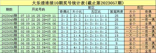 上期回顾:体彩大乐透第2023057期开出奖号:01 05 06 19 24 + 05 11。其中前区奖号奇偶比为3:2,大小比为2:3,五区比为3:0:1:1:0,跨度为23。后区奖号大小比为1:1,奇偶比为2:0。