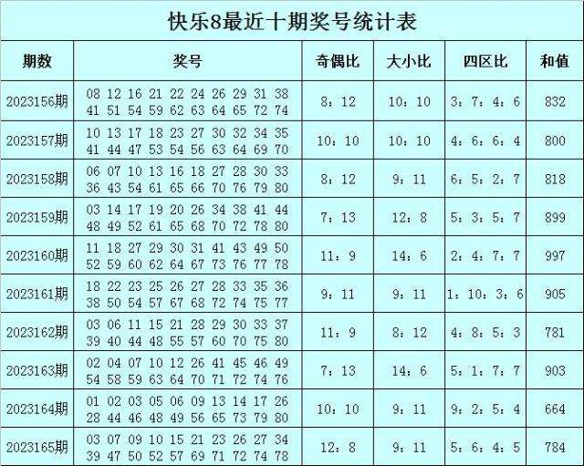 福彩快乐8第2023165期开奖回顾:03 07 09 10 15 21 23 26 27 34 39 47 50 52 57 69 71 72 74 78,其中奖号四区比为5:6:4:5,奇偶比比为12:8,大小比为9:11,和值为784。