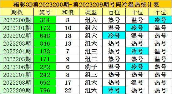 上期回顾:福彩3D第2023209期开奖奖号为:796,奖号类型为:组六,奖号冷温热态为:冷号+热号+热号。