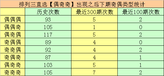 排列三第2023033期奖号为679,直选奇偶分布为:偶奇奇,该奇偶分布历史上共出现了792次,前100期出现11次。