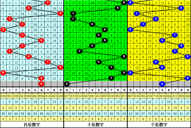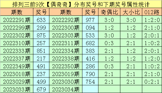 在最近9期开出奇偶分布:偶奇奇的奖号为:633-299-875-257-851-217-491-237-499,在下期出现号码分别为:977-094-533-682-383-416-286-790-754。其中百十个位号码分布情况如下: